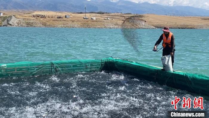 9月9日,记者来到位于新疆伊犁尼勒克县喀拉苏乡的三文鱼衍生基地。图为衍生工向网箱中的虹鳟鱼抛撒饵料。中新社记者 朱贺 摄